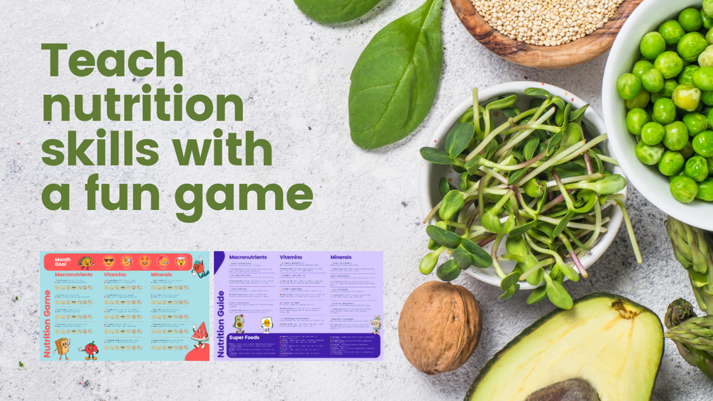 Kids score points by choosing balanced foods, filling their plate with color, and trying new ingredients. The placemat includes built-in spots to track their weekly nutrition goals and monthly progress so they can “win” the game over time.